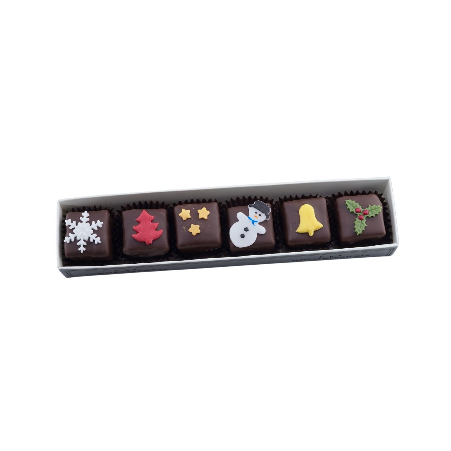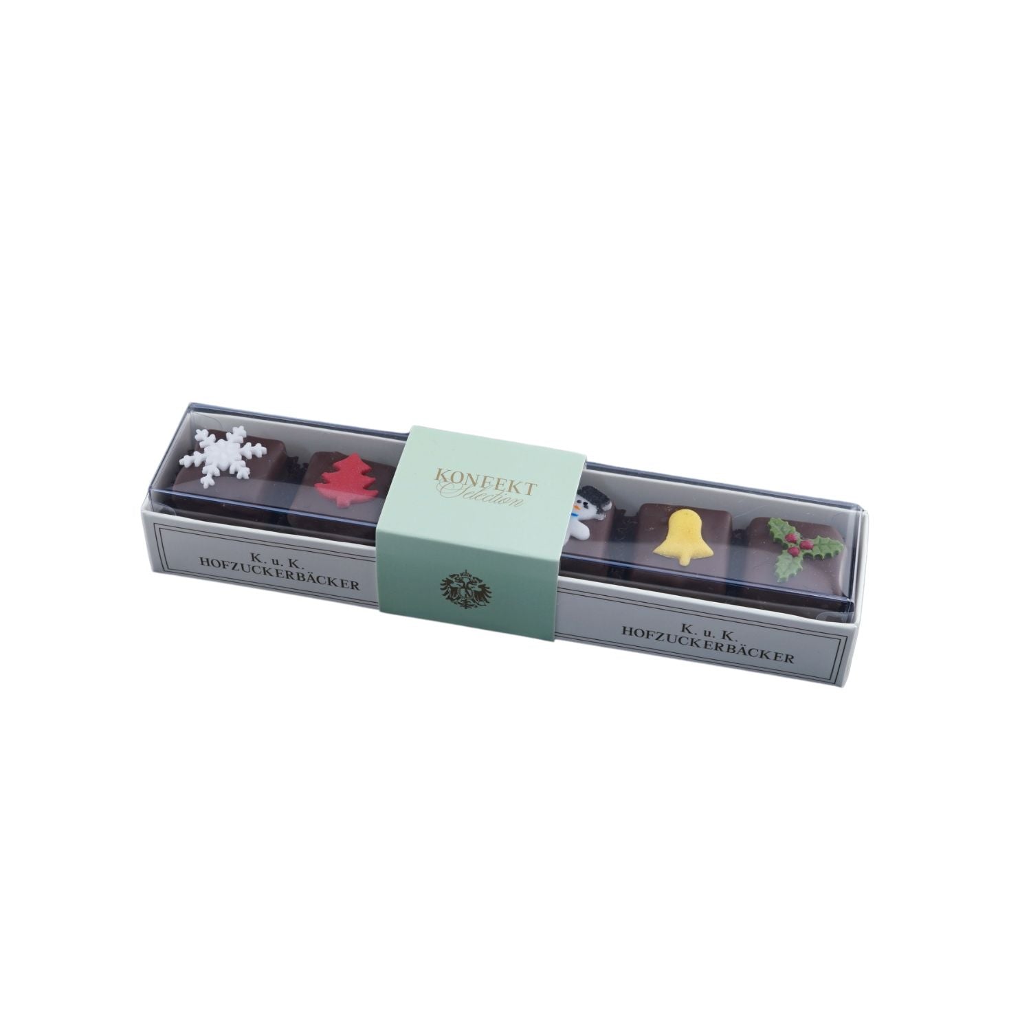 Lebkuchen gefüllt mit dreierlei Marzipan – Klassik, Orange, Pistazie – überzogen mit Zartbitterschokolade.