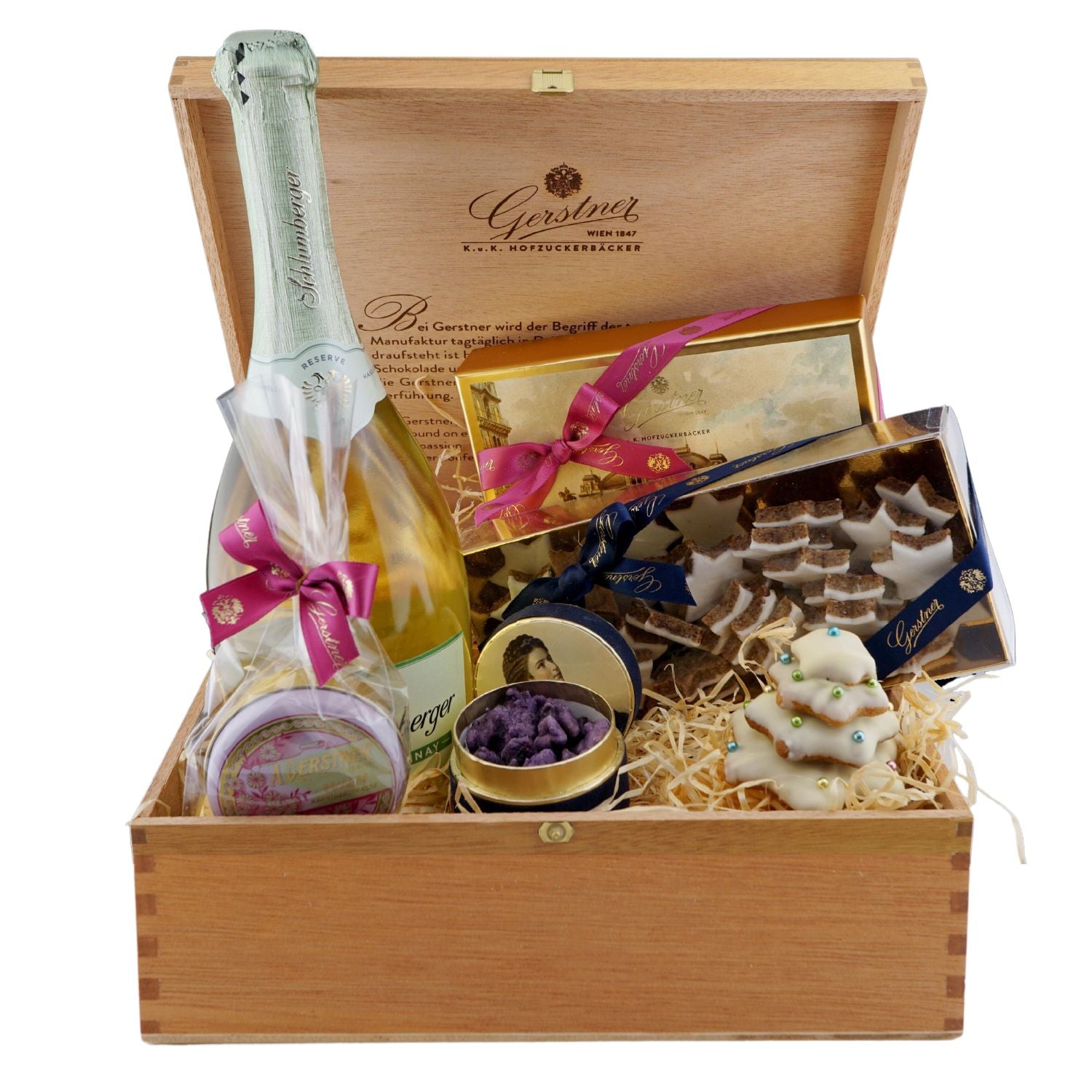 Edle Holzbox gefüllt mit Schlumberger Chardonnay Reserve 0,75 l, Zimtsterne 250g, kleinem Lebkuchen Christbaum, Pfefferminztragant, Sisi Veilchen und 12 Stk. Konfekt in der Traditionsbox.