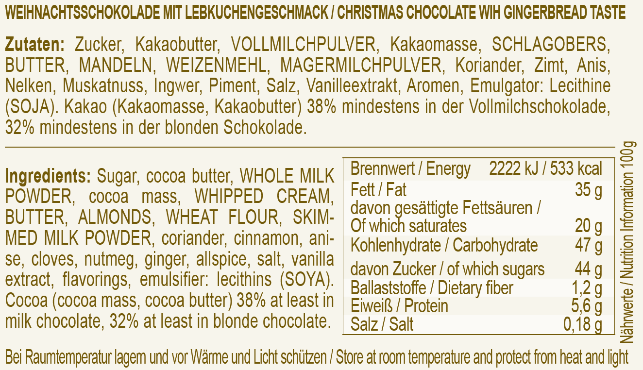 Feine Vollmilchschokolade mit weihnachtlichen Lebkuchenfüllung.