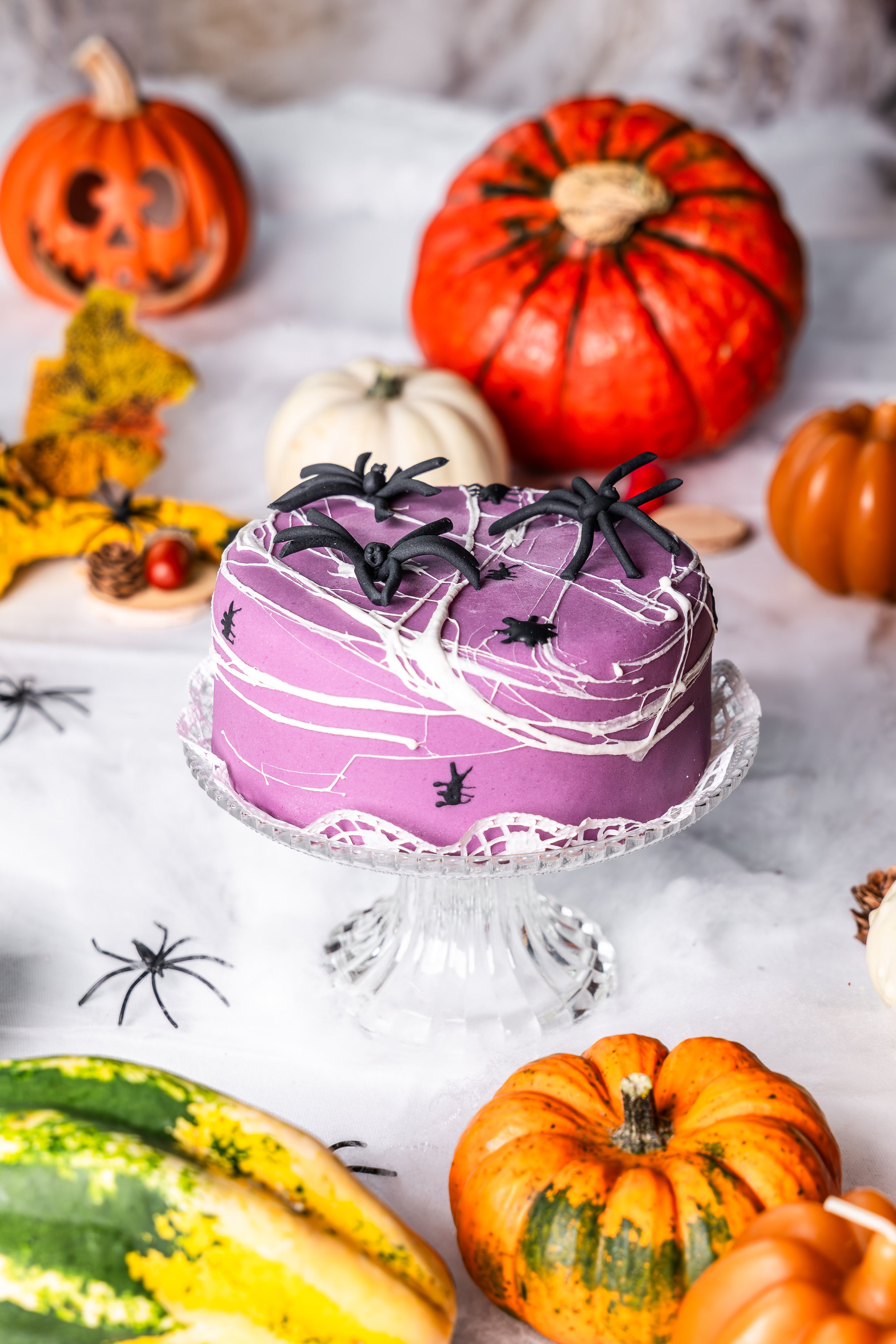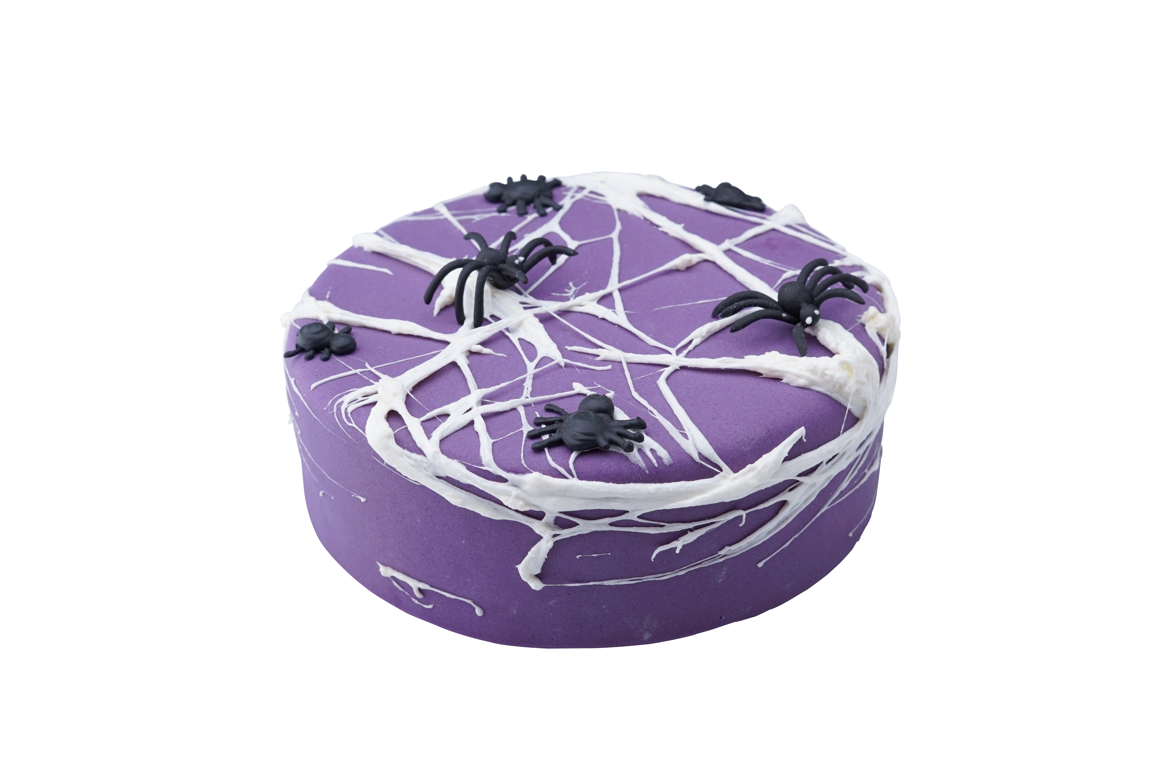 Sacher Torte in lila Zuckerfondant eingedeckt und mit schaurig schönen weißen Schokoladen Spinnweben wie auch Spinnen-Marshmallows dekoriert.