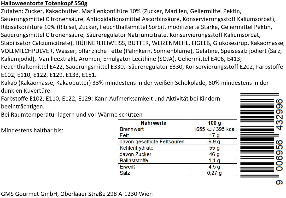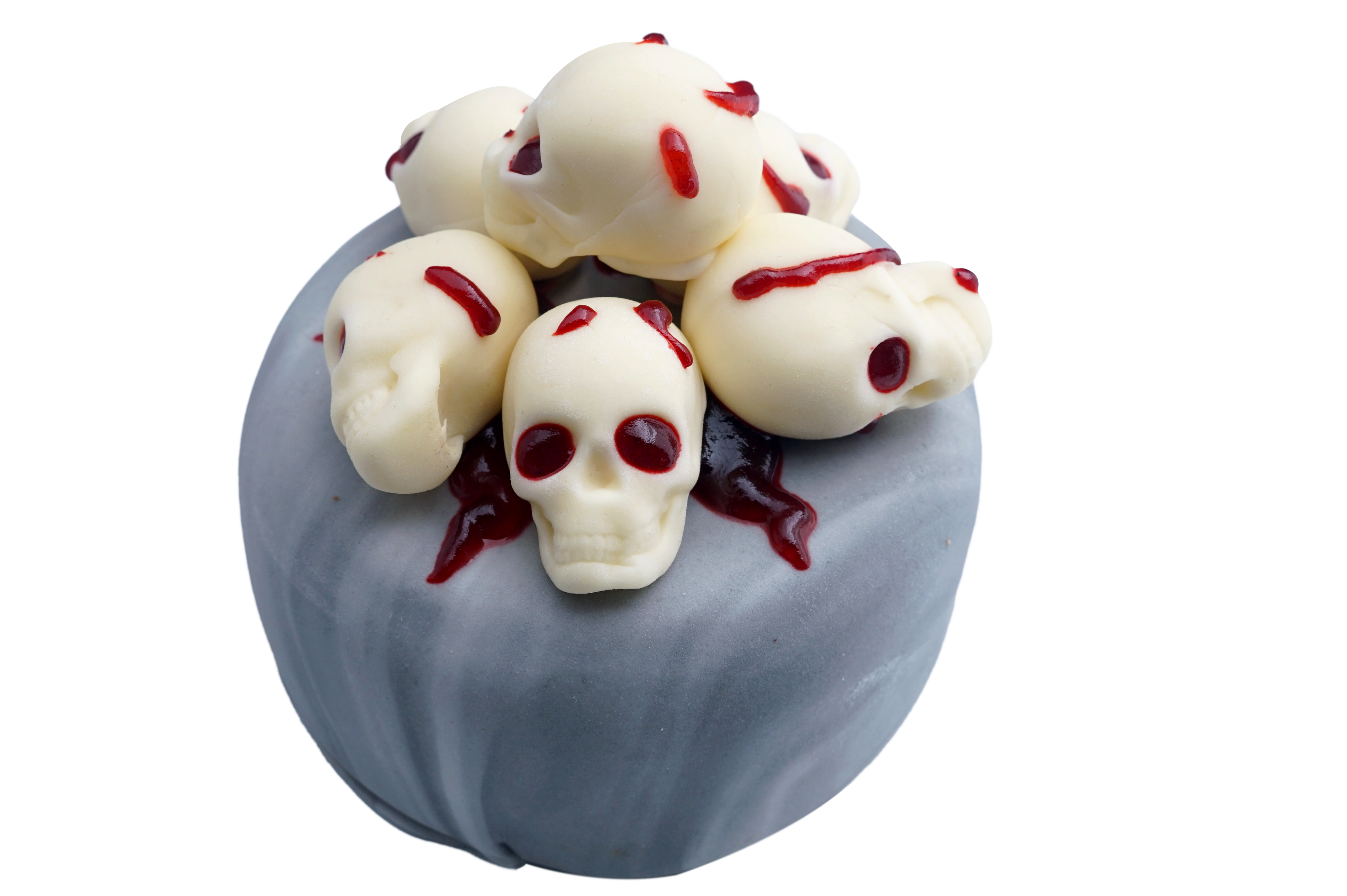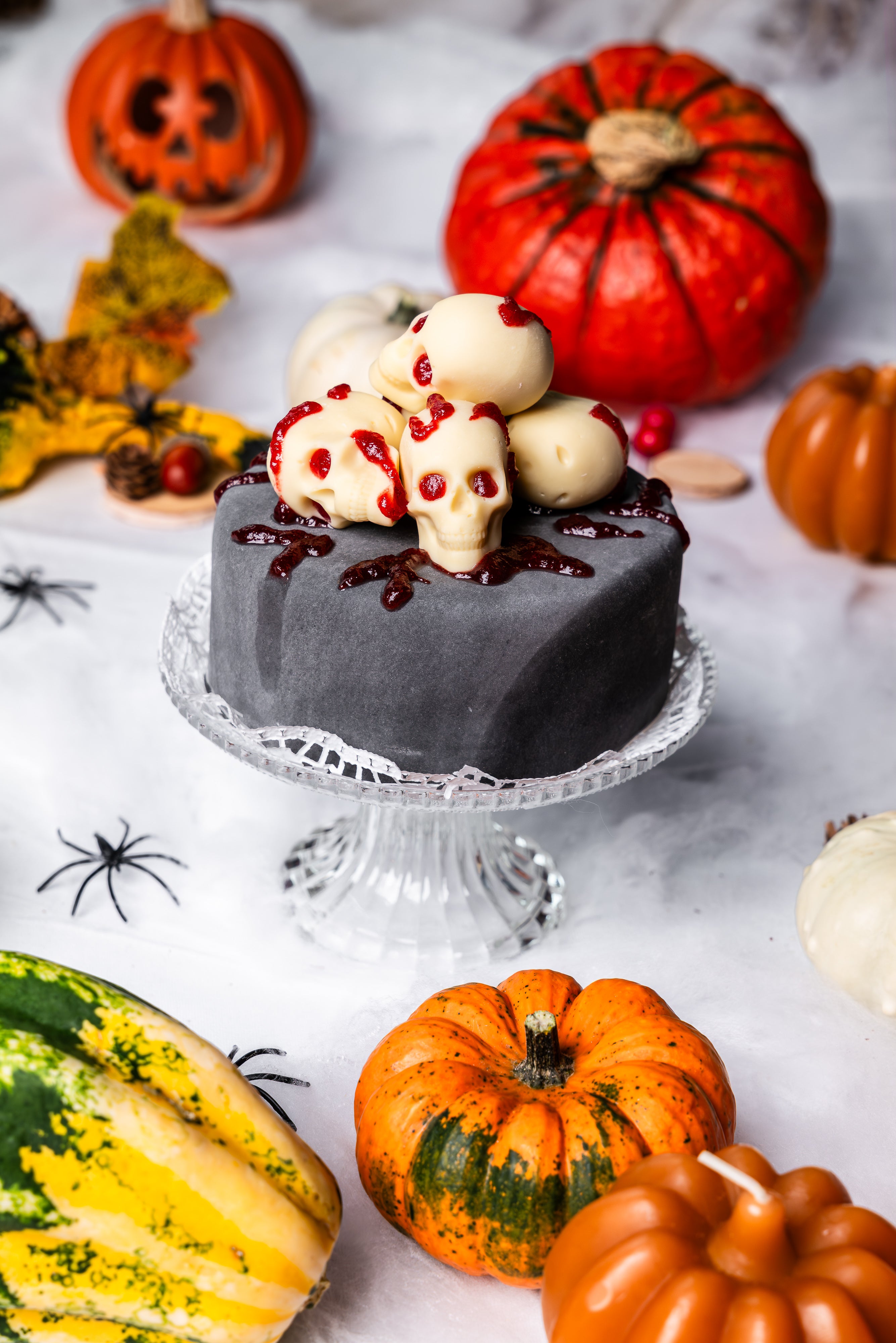 Sacher Torten in schön schaurigem marmoriertem Zuckerfondant eingedeckt und mit weißen Schokoladen Totenköpfen und Ribiselkonfitüre dekoriert.
