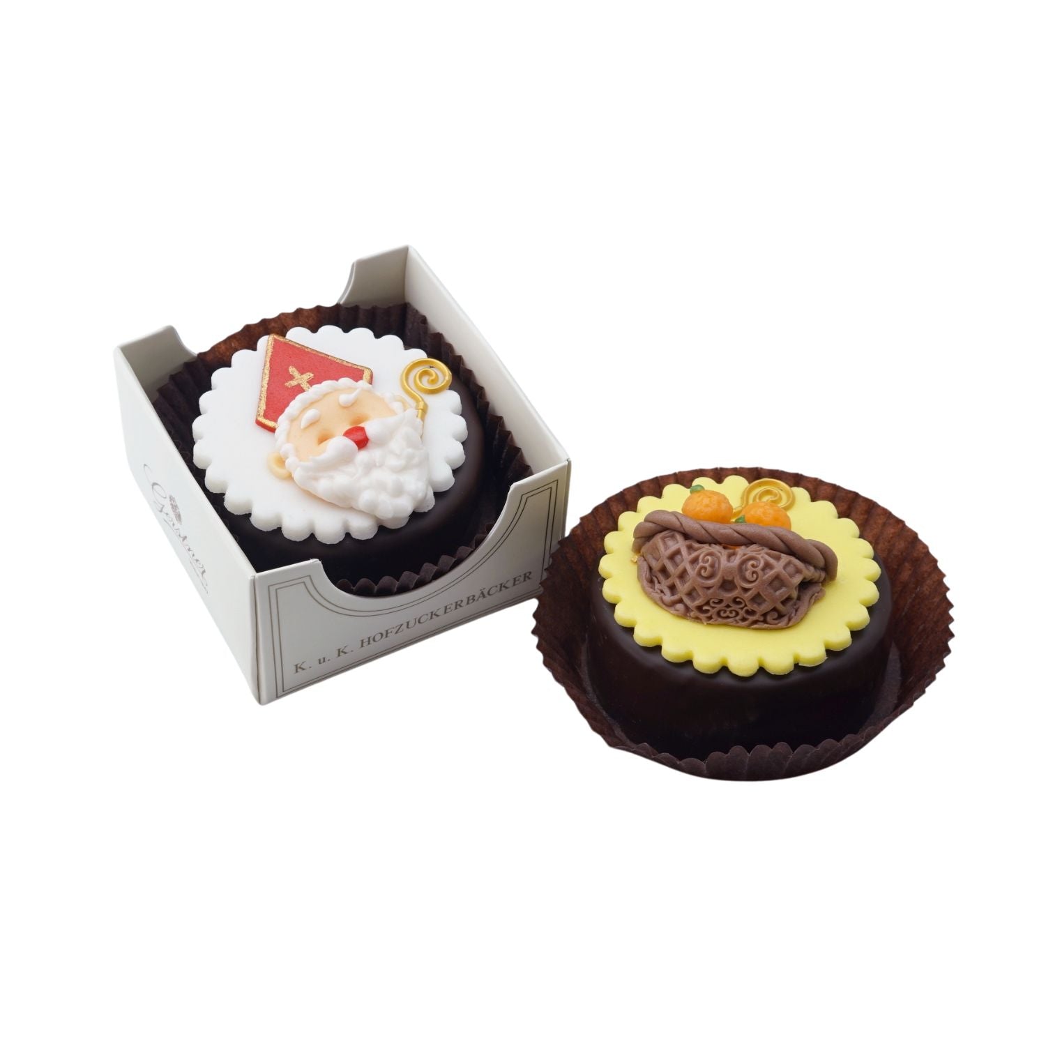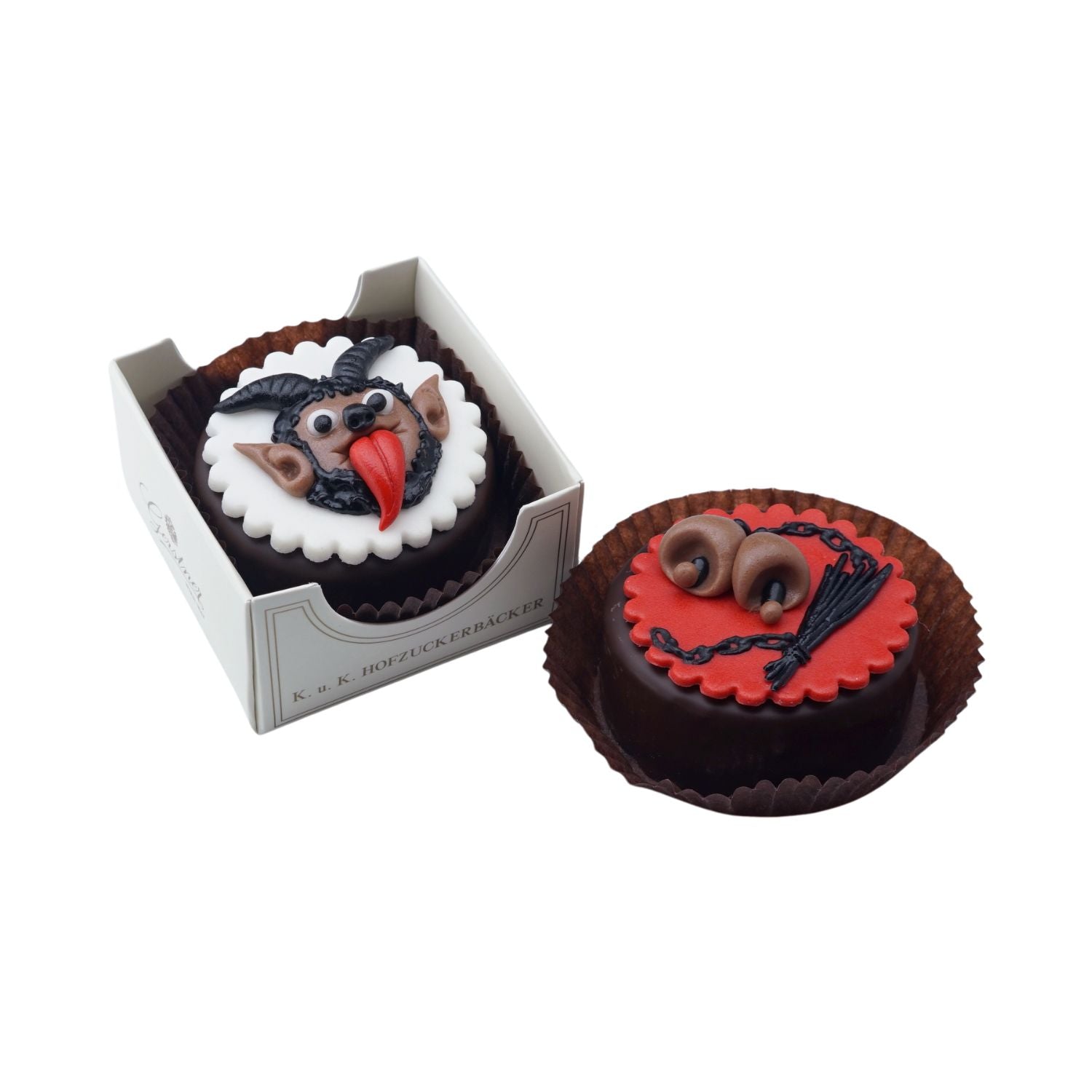 Chocolate nougat thalers with crispy toasted wafer pieces and St. Nicolas or Crampus decoration.