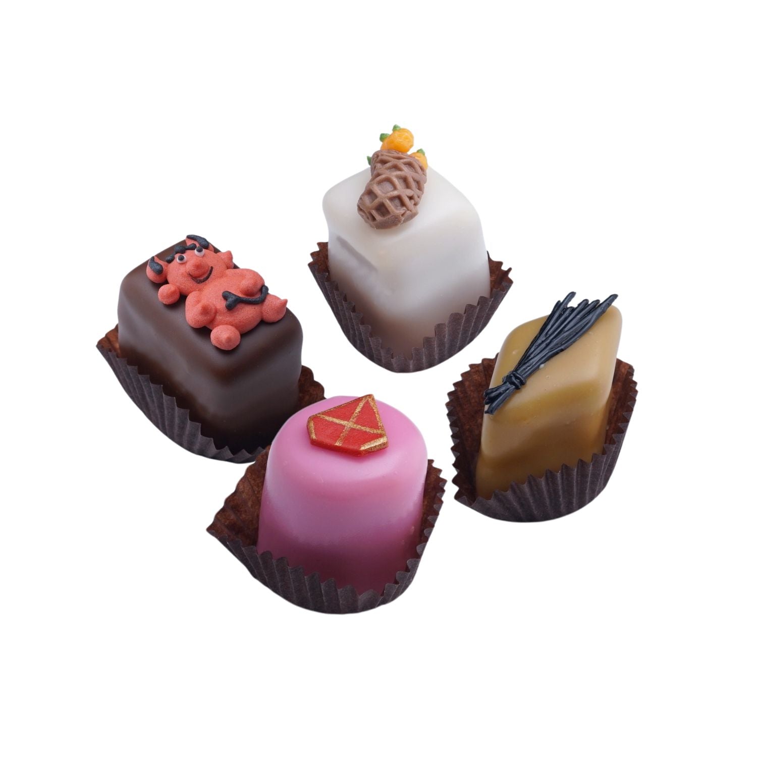 Petit fours with orange flavor or made from juicy chocolate mass in St. Nicolas & Crampus design.